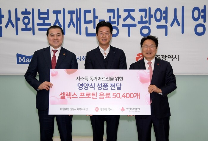 | ▲ 강기정 광주광역시장이 29일 오전 매일유업 광주공장에서 겨울추위에 취약한 독거어르신을 위한 영양음료를 고정수 매일홀딩스(주) 상무로부터 전달받은 후 기념촬영을 하고 있다./광주광역시 제공 |