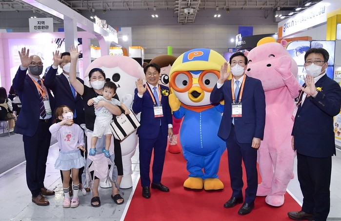 [광주=정찬남 기자] 강기정 광주광역시장이 22일 오후 서구 김대중컨벤션센터에서 열린 2022 광주 에이스페어(Asia Content & Entertainment Fair) 개막식에 참석해 내빈들과 방송 캐릭터 인형과 기념촬영을 하고 있다./광주광역시 제공