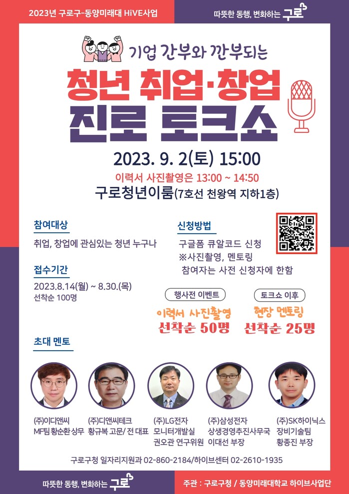 [시민일보 = 이대우 기자] 서울 구로구(구청장 문헌일)가 동양미래대와 공동으로 추진하는 하이브 사업의 일환으로 ‘2023년 청년 취업·창업 진로 토크쇼’를 개최한다.