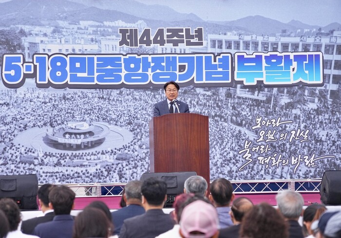| ▲ 강기정 광주광역시장이 27일 5·18민주광장에서 열린 ‘제44주년 5·18 부활제’에 참석해 추모사를 하고 있다. / 광주광역시 제공 |