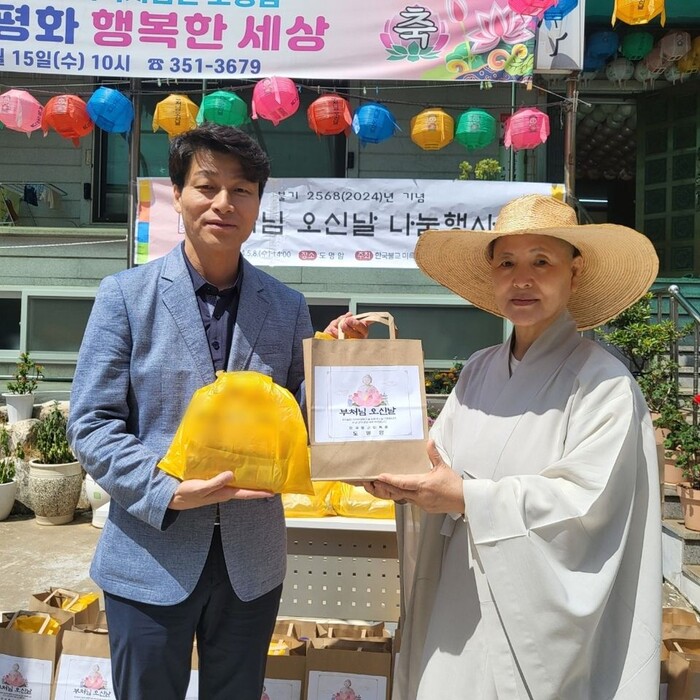 매년 봉축 기간에 자비 나눔을 실천하고 있는 도명암은 올해도 유기농 식빵을 구산동주민센터에 전달했다. 이날 ‘자비 나눔 전달식’에는 박재균 구산동장과 주지 묘각 스님, 도명암 신도회 임원 등이 자리를 함께했다.