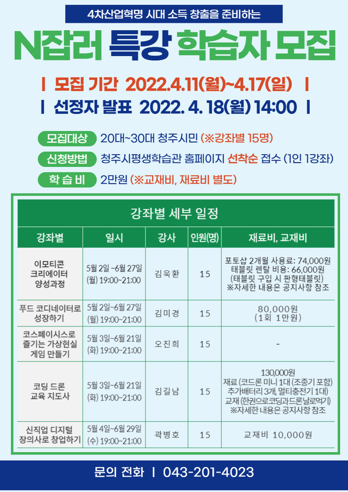 청주시평생학습관이 4월 11일부터 17일까지 2030 청주 시민을 대상으로 ‘N잡러 특강’에 참여할 수강생을 모집한다.