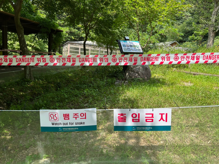 공단은 뱀이 자주 출몰하는 탐방로나 그늘진 쉼터, 계곡 주변에 ‘뱀 주의’ 안내판과 야영장에는 ‘뱀 그물’을 설치하는 등 탐방객의 안전을 관리하고 있다.