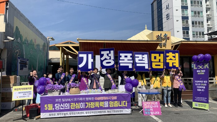 이날 캠페인에는 합천경찰서, 합천군, 합천가정상담센터, 합천군여성단체협의회 4개 기관이 참여하여 ‘가정폭력 추방 합동 결의식’을 통해 폭력 근절 의지를 다지고, 보라색 카네이션과 함께 홍보 물품을 배부하는 등 군민 모두의 참여와 공감대 형성을 위해 노력했다.