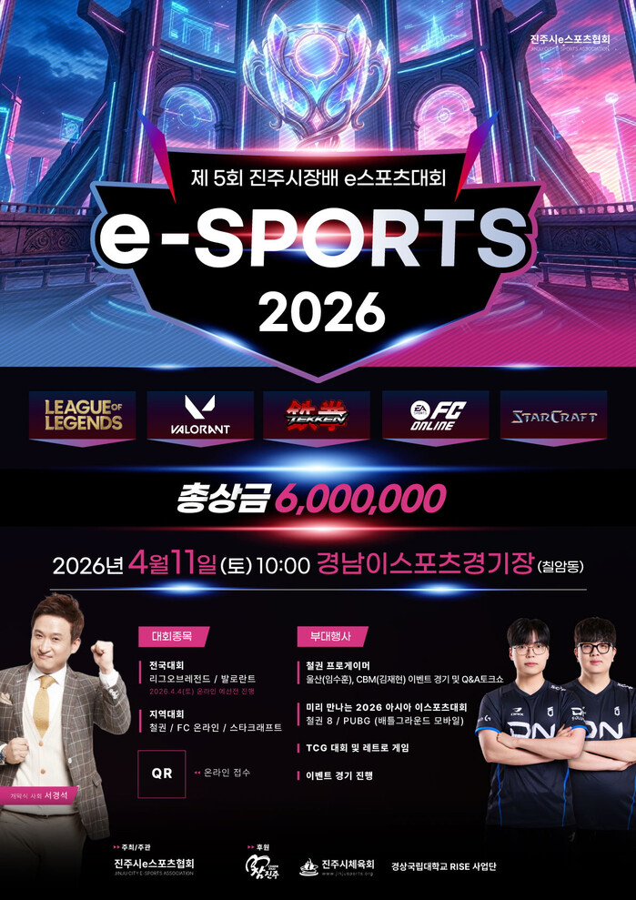 진주시는 오는 11일 경상국립대학교 칠암캠퍼스 100주년 기념관에 있는 경남 이(e)스포츠 상설경기장에서 ‘2026 진주 아마추어 e스포츠 대회’를 개최한다고 밝혔다.