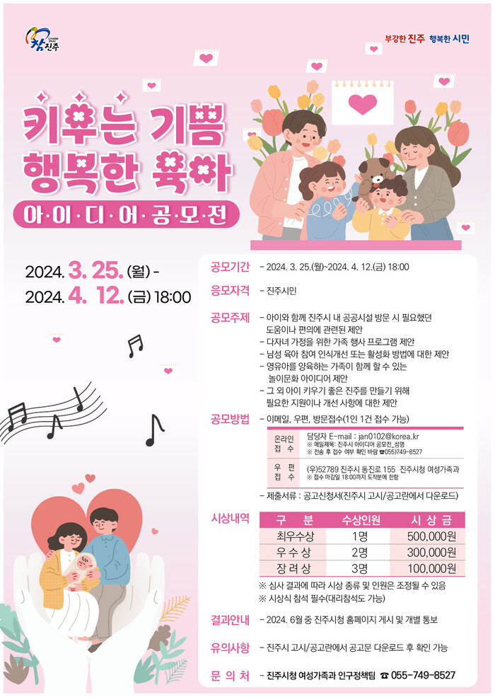 진주시는 시민들의 결혼·출산·육아에 대한 관심을 유도를 위한 ‘키우는 기쁨 행복한 육아’아이디어 공모전을 개최한다.