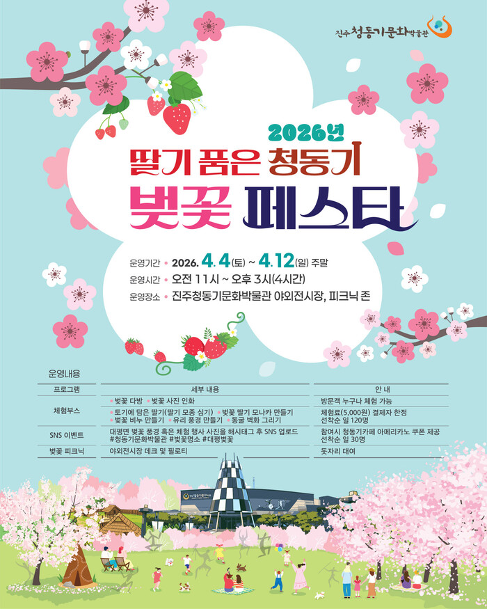 진주청동기문화박물관은 4월 한 달 동안 대평면의 특산품인 딸기를 활용한 체험 프로그램 ‘브론즈 딸기 뷔페: 두바이 입은 대평 딸기’도 운영 중이다. 참여자들은 딸기의 생육 과정과 수확 방법을 배우고, 직접 딸기 수확과 요리 체험까지 즐기며 지역 특산물의 가치를 자연스럽게 체험할 수 있다. 이번 벚꽃 페스타는 이러한 딸기 체험 프로그램과 봄 테마 행사를 연계해, 박물관만의 차별화된 계절형 콘텐츠를 선보이는 자리이기도 하다.