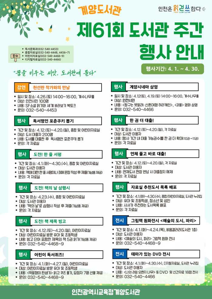 4월 26일 천선란 작가와의 만남을 비롯해, 책 제목 빙고, 책의 날 기념 삼행시 짓기 등 다양한 행사가 된다.
