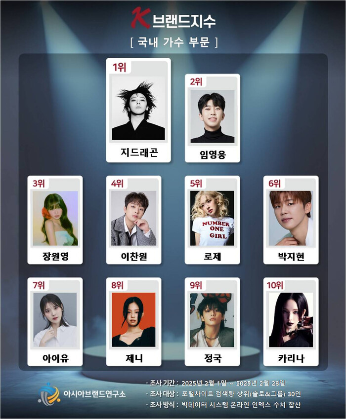 K-브랜드지수 국내 가수 부문 1위는 지드래곤이 차지했으며, 2위 임영웅, 3위 장원영(아이브), 4위 이찬원, 5위 로제(블랙핑크), 6위 박지현, 7위 아이유, 8위 제니(블랙핑크), 9위 정국(BTS), 10위 카리나(에스파) 등이 TOP10에 이름을 올렸다.