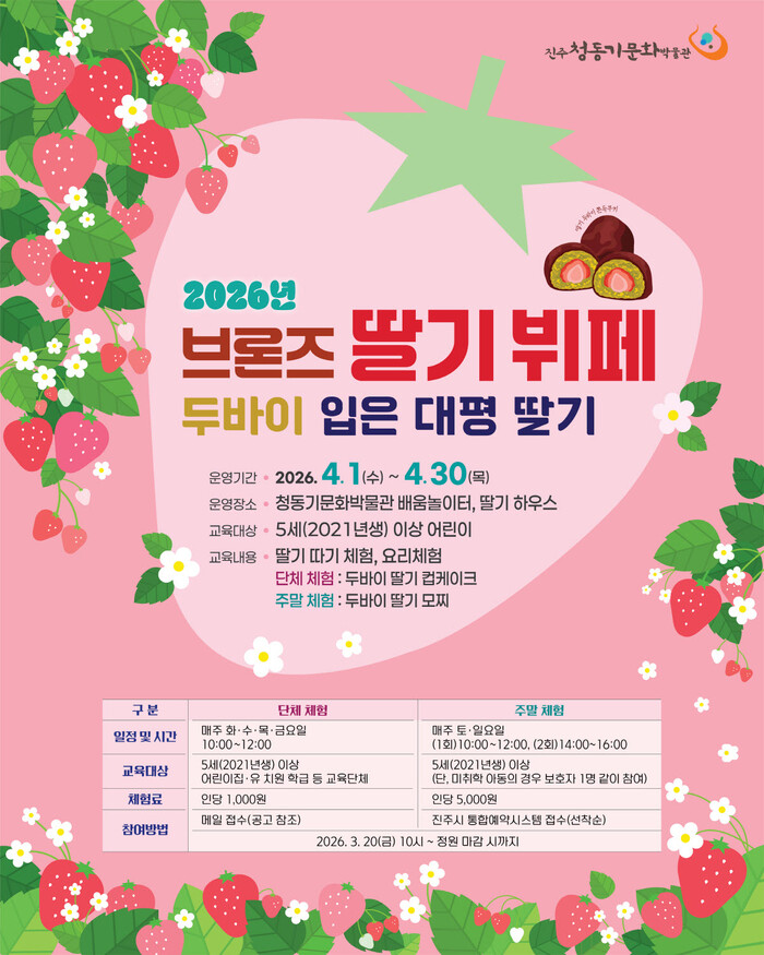 진주시는 4월 한 달간 ‘진주청동기문화박물관’에서 대평면 특산품인 딸기를 활용한 교육 프로그램 ‘브론즈 딸기 뷔페: 두바이 품은 대평 딸기’를 운영한다.