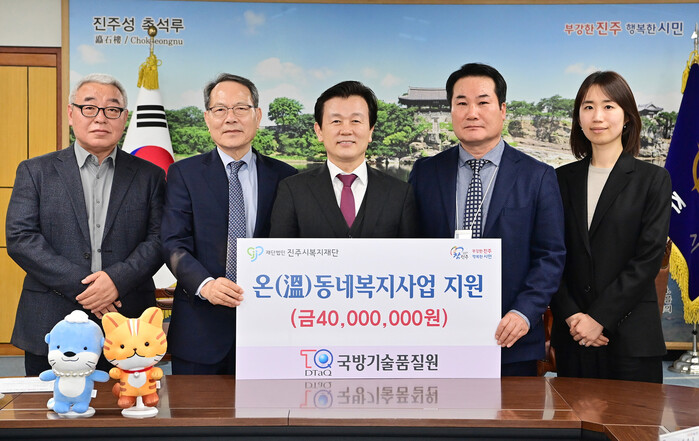 국방기술품질원(원장 신상범)은 지난 17일 시청 기업인의 방에서 지역사회 어려운 이웃을 돕기 위해 성금 4000만 원을 진주시복지재단(이사장 이성갑)에 기탁했다.