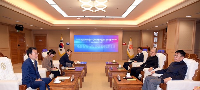 [광주=정찬남 기자] 문영훈 광주광역시 행정부시장이 7일 오전 시청 비즈니스룸에서 한팡밍 중국전국정협외사위원회 부주임을 접견하고 광주시와 교류협력 방안 등을 논의하고 있다. /광주광역시 제공