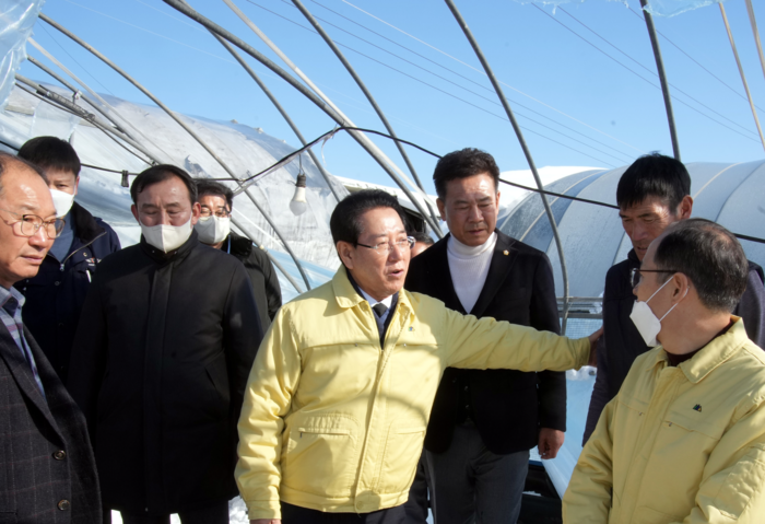 [남악=황승순 기자]김영록 전라남도지사는 24일 폭설로 시설하우스가 무너져 피해를 입은 담양 대전면 딸기농가 피해 현장을 방문해 현장 실태를 점검하고, 신속한 피해조사 및 복구지원을 강조했다.