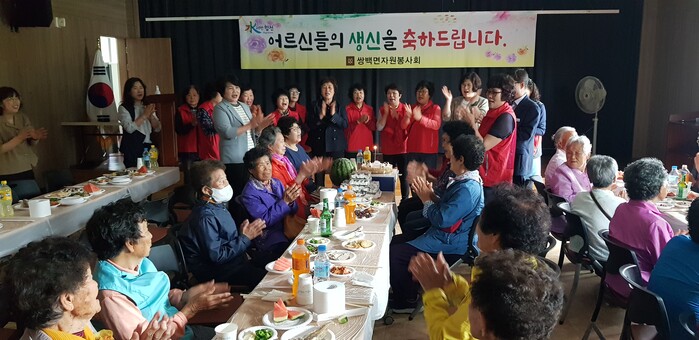 이번 행사는 쌍백면 자원봉사회 주관으로 회원 20여 명과 정순옥 정심회장, 이정임 여성단체협의회장 등이 참석해 홀로 사는 어르신들을 위해 정성껏 준비한 음식을 대접하고 축하케이크 불기, 말벗봉사 등을 진행했다.