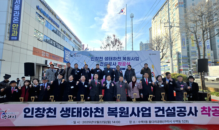 [구리=최광대 기자] 구리시(시장 백경현)는 12월 22일 수택1동 돌다리공원에서 ‘인창천 생태하천 복원사업 건설공사 착공식’을 개최했다. 이날 행사에는 구리시의회 신동화 의장과 시의원, 나태근 국민의힘 당협위원장, 이은주 도의원, 지역 주민, 시민단체 등이 참석해 30여 년 만에 도심 속 자연 하천이 다시 시민 품으로 돌아오는 역사적 순간을 함께했다.