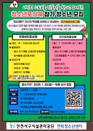 [인천=김형만 기자] 인천서구시설관리공단 연희청소년센터가 1월 20일부터 7~24세 청소년을 대상으로 청소년포상제 참가자를 모집한다.
