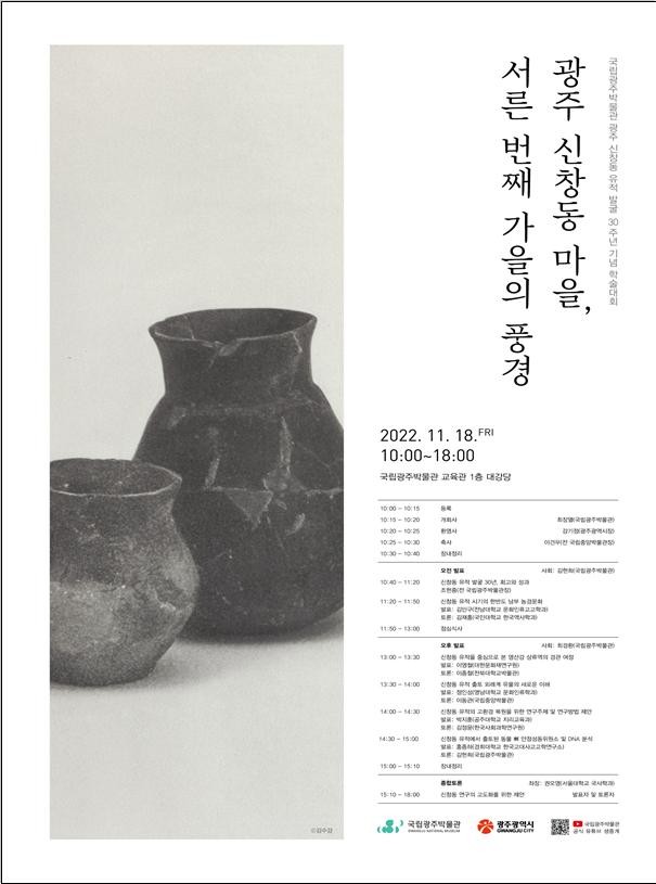 광주 신창동 유적의 연혁 및 농경, 경관, 교류 등을 주제로 ‘신창동유적 발굴 30년, 회고와 성과’(조현종, 전국립광주박물관장), ‘신창동 유적 시기의 한반도 남부 농경문화’(김민구, 전남대 교수), ‘신창동 유적 출토 외래계 유물의 새로운 이해’(정인성, 영남대 교수) 등 발표와 서울대학교 권오영 교수가 좌장을 맡은 토론이 이어질 예정이다.