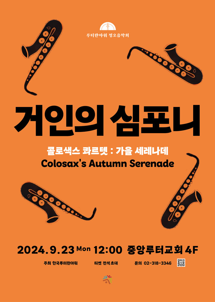 이번 음악회는 색소폰 사중주단 콜로삭스(colosax)의 “가을의 세레나데”라는 타이틀로 기획됐으며, 오는 23일 월요일 오후 12시 서울 용산구에 위치한 중앙루터교회 본당 4층에서 펼쳐진다.