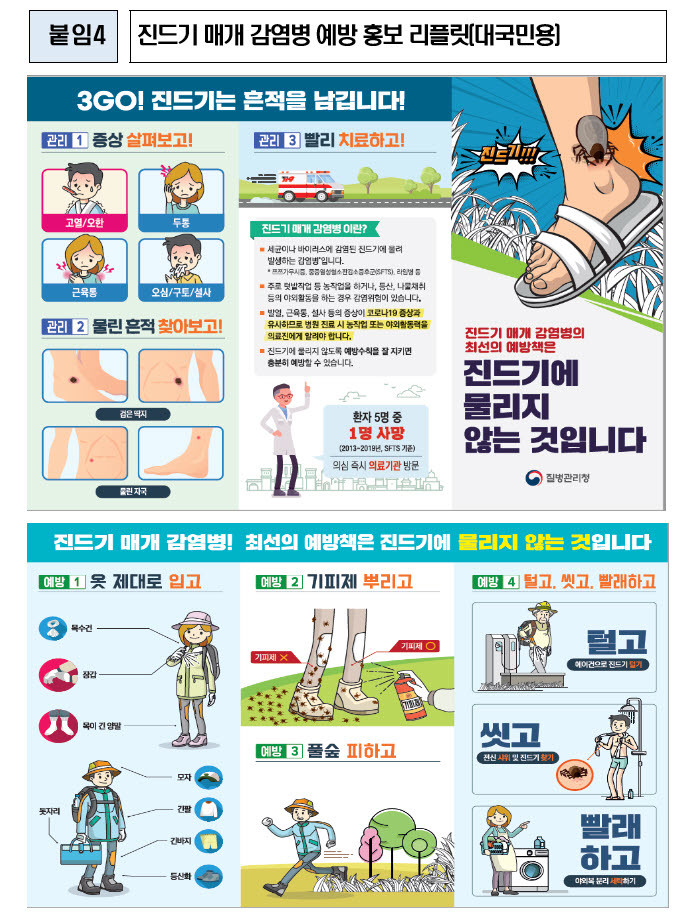 청주시 보건소 관계자는 “SFTS는 치료제와 예방 백신이 없고, 치사율이 높은 감염병으로, 진드기가 활동하는 계절에 야외활동 시 진드기에 물리지 않는 것이 무엇보다 중요하다”고 강조하고, “야외활동 시 진드기 매개 감염병 예방수칙을 준수할 것”을 당부했다.
