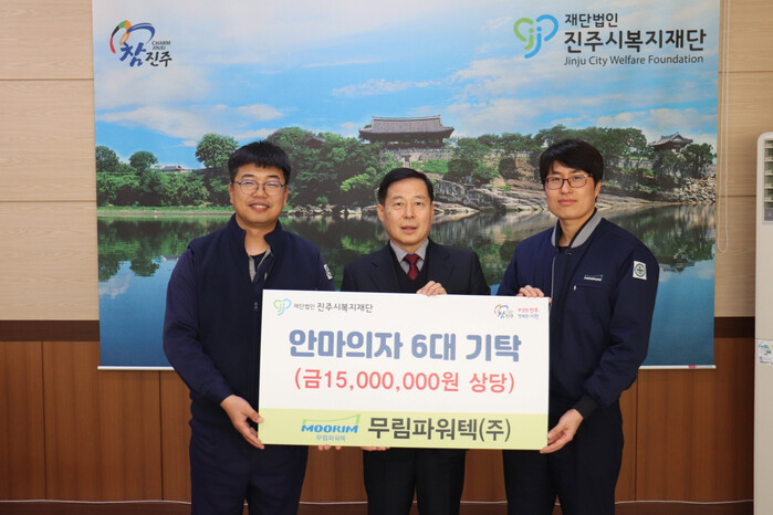 무림파워텍㈜(대표 임용수)는 3일, 사업장 주변 지역 주민의 복지 향상과 건강 증진을 위해 안마의자 6대(환가액 1500만 여원 상당)를 진주시복지재단(이사장 이성갑)에 기탁했다.