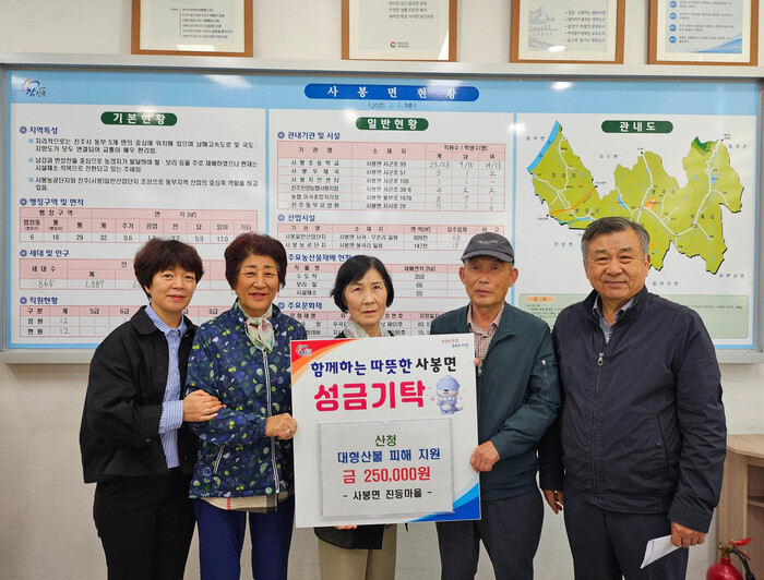 진주시 사봉면 진등마을 주민들은 28일 산청군 산불 피해 이재민들을 돕기 위해 성금 25만 원을 기탁하였다.