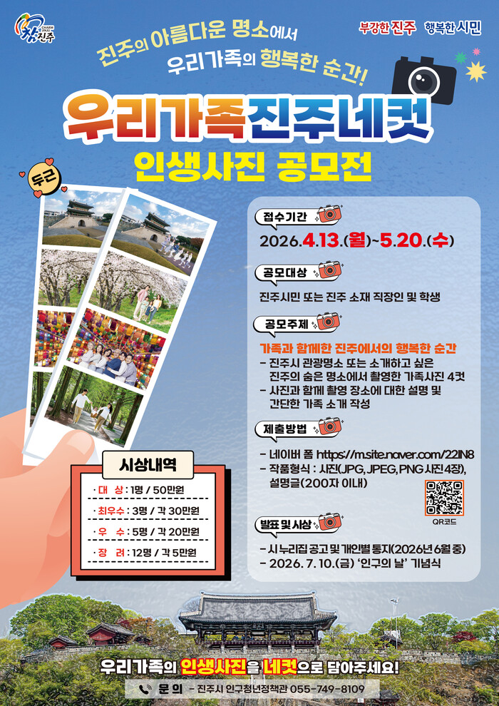 진주시는 가족과 함께한 일상 속 행복한 순간을 공유하고 가족 친화적 가치를 확산하며 지역에 대한 애향심을 높이기 위해 2026년 인구정책 「우리 가족 진주 네 컷」 인생사진 공모전을 개최한다.