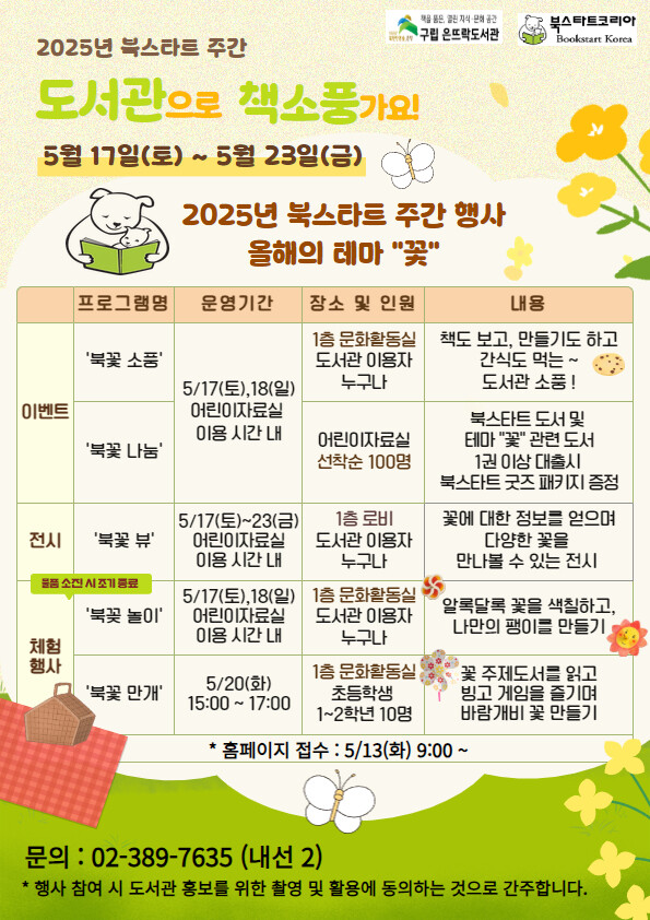 북스타트는 ’책과 함께 인생을 시작하자‘는 취지로 2023년부터 시작된 행사로 올해에는 ’도서관으로 책소풍 가요‘라는 슬로건 아래 ’꽃‘을 테마로 하여 진행한다.