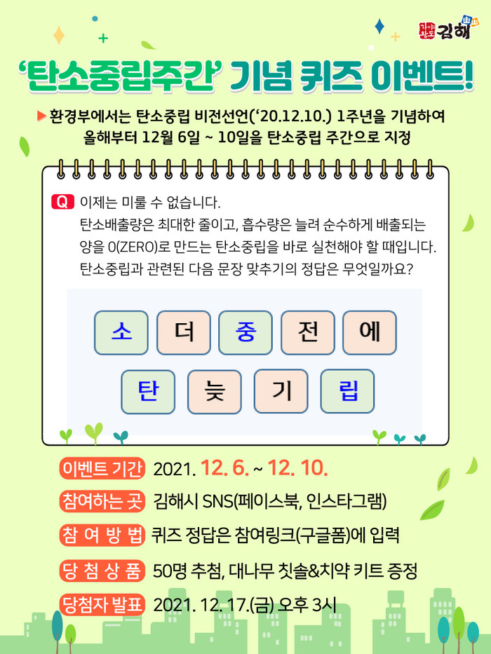 먼저 시는 탄소중립의 의미와 시급성을 많은 시민에게 알리기 위해 ‘더 늦기 전에 탄소중립’ 문장 맞추기 퀴즈 이벤트를 온라인으로 진행한다.