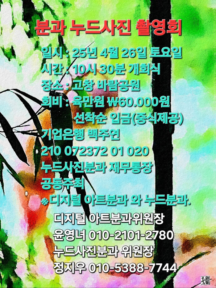 (사)한국사진작가협회 누드사진분과위원회는 사진을 사랑하는 회원들과 함께 오는 4. 26일(토요일) 오전 10시 30분 활창한 봄 맞이 춘계 촬영대회를 지털 아트분과와 공동으로 진행된다고 밝혔다.