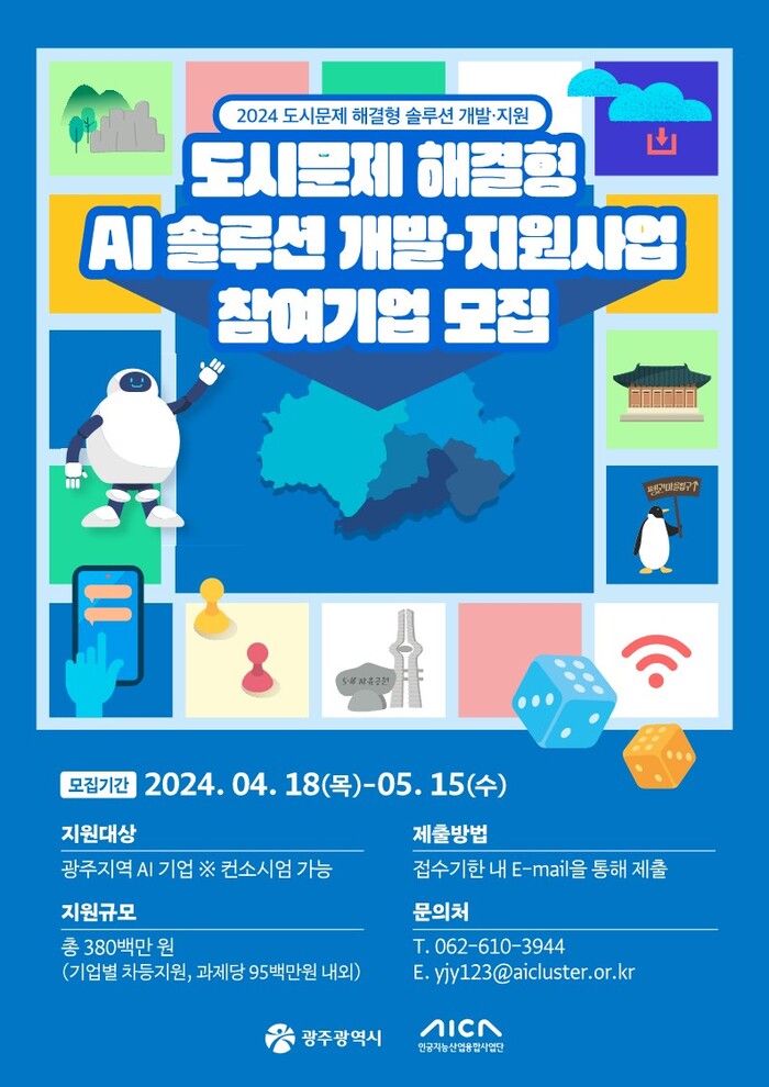 광주광역시(시장 강기정)는 ‘도시문제 해결형 AI 솔루션 개발·지원사업’에 참여할 기업을 5월 15일까지 모집한다. 시민 생활과 관련된 도시문제에 지역기업의 인공지능(AI) 기술을 접목하고 이를 해결함으로써 시민 편의 확대와 지역 인공지능 기업의 성장 촉진을 위한 것이다.