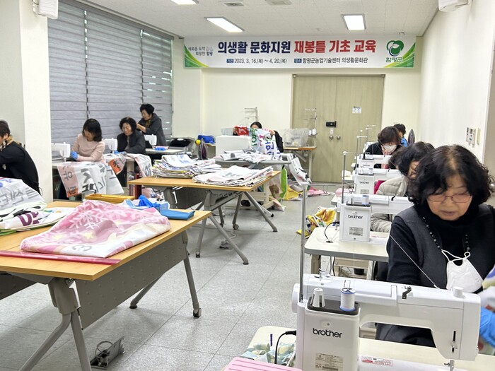 회원들은 농업기술센터에서 추진한 ‘재봉틀 기초교육’을 통해 배운 기술을 활용해 폐현수막을 마대자루로 새롭게 재탄생시켰다.