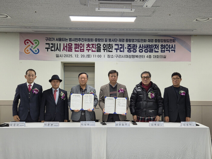 구리가 서울되는 범시민추진위원회 이상배, 이춘본, 곽경국 공동위원장은 중랑구 중랑의 길 봉사단 남궁일주 단장, 차보권 상임고문, 재경 중랑경기도민회 김종섭 회장, 재경 중랑강원도민회 김용하 회장과 함께 2025년 12월 20일 11시에 구리시 여성행복센터에서 ‘구리시 서울 편입 추진을 위한 구리·중랑 상생발전 협약식’을 개최하고, 상호 협력체계 구축을 공식화했다.
