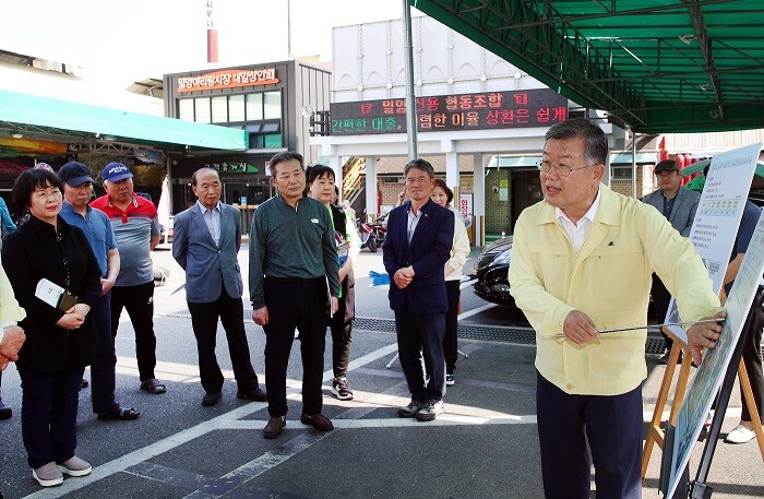 박일호 시장은 먼저 밀양아리랑시장을 찾아 52억원 규모의 주차장 확장사업과 60억원 규모의 상권르네상스 사업에 대한 브리핑을 받고 현장을 살폈다.