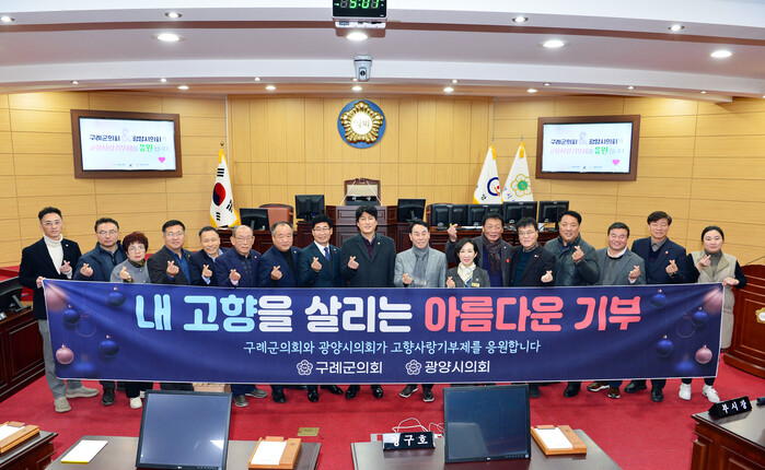 [광양=황승순 기자]광양시의회(의장 최대원)와 구례군의회(의장 장길선)는 지난 23일 광양시의회에서 고향사랑기부금을 서로에게 기부하는 뜻깊은 행사를 가졌다.
