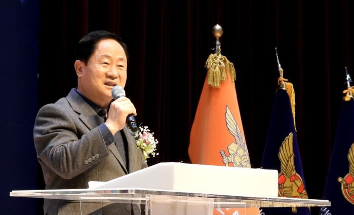 ▶ 주광덕 시장이 연합회장 및 대장 이·취임식에서 축사를 하고 있다[사진=최광대 기자]