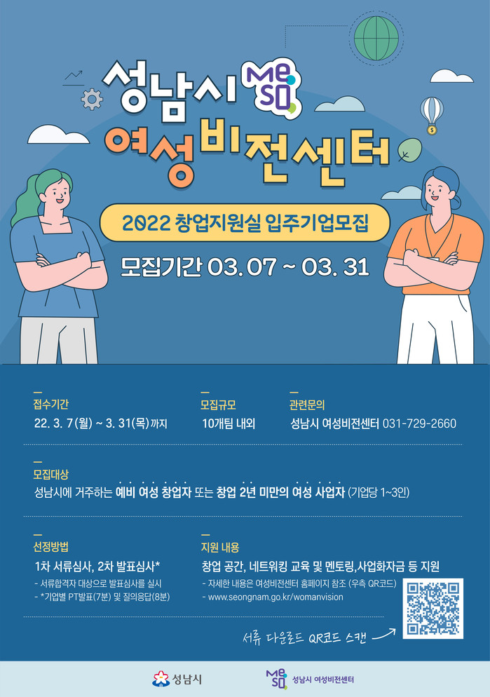 신청 대상은 공고일(2.28) 기준 성남시에 사는 예비 여성 창업자, 창업 2년 미만의 여성 사업자(기업당 1~3명)이다.
