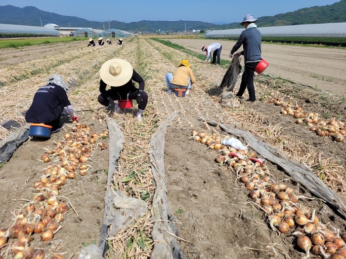 본격적인 농번기를 맞아 3일 합천군 초계면사무소 직원 10여 명이 초계면 관평리에서 양파 수확 일손돕기에 나섰다.