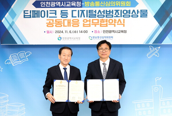 [인천=김형만 기자] 인천시교육청은 11월 6일 방송통신심의위원회와 딥페이크 등 디지털 성범죄 영상물 공동 대응을 위한 업무협약을 체결했다고 밝혔다.