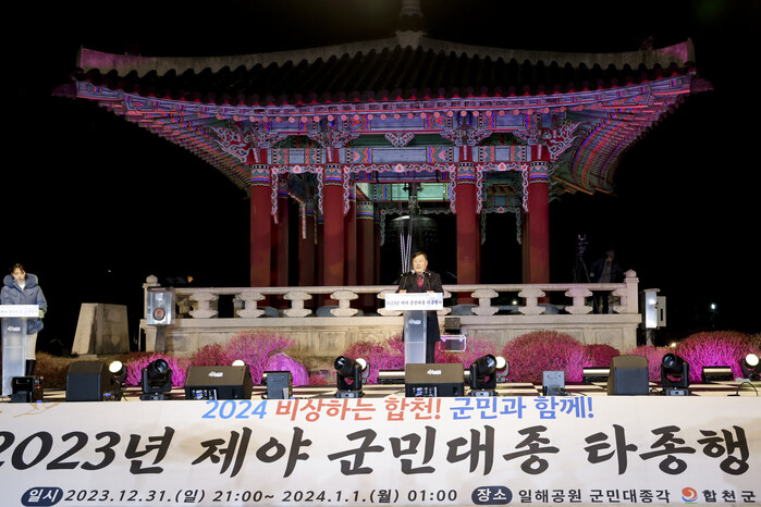 군민들과 함께하는 새해 카운트다운에 이어 24시 정각 나라의 태평과 합천군민의 평안을 기원하는 33타 타종으로 희망찬 새해를 맞이했다.