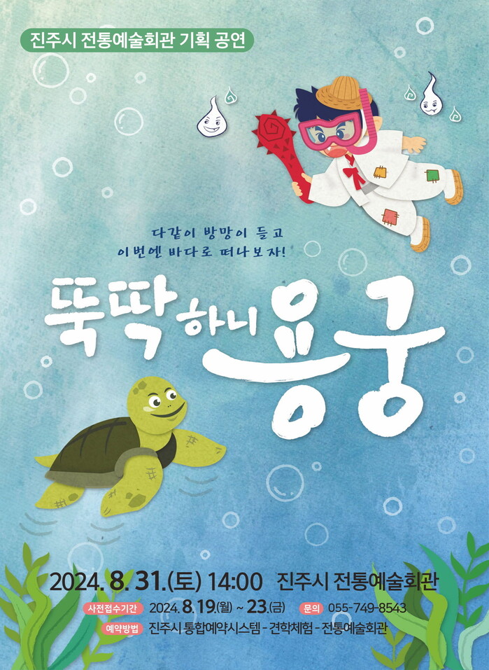 진주시는 오는 31일 오후 2시 진주시 전통예술회관에서 전래동화 ‘별주부전’을 각색하여 만든 체험형 어린이 뮤지컬 ‘뚝딱하니 용궁’을 선보인다.