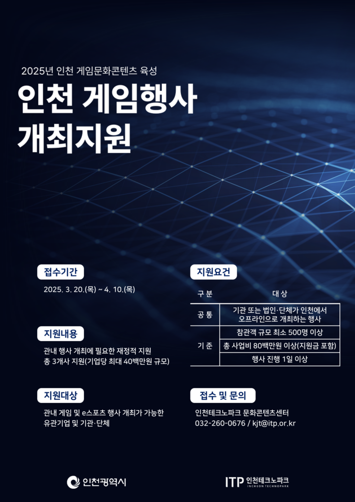 이 사업은 인천시가 추진하는 ‘인천 게임문화 콘텐츠 육성’의 일환으로, 인천에서 오프라인 게임 행사를 개최하는 기관·단체에 개최 비용을 1.2억 원(기관당 4천만 원)까지 지원하는 내용이다.