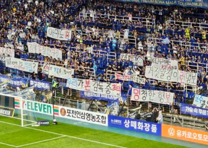 해당 게시물은 울산 현대 축구장의 관중석을 뒤덮은 홍명보 관련 장면으로, 공개 당시 팬들의 비난 여론을 증폭시키며 큰 주목을 받았다.