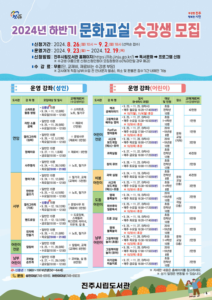 진주시립도서관은 오는 26일부터 지역민들에게 독서문화 생활과 평생교육 기회를 제공하는 ‘2024년 하반기 문화교실’ 수강생을 모집한다.