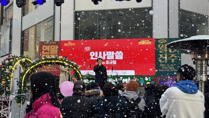 진주시와 진주문화관광재단이 주최·주관한 월간진주 6회차 ‘연말대전’은 ‘진주에 눈이 온다면?’을 주제로 눈이 잘 내리지 않는 진주에서 눈을 볼 수 있는 인공눈 연출부터 시민 참여형 거리공연 콘텐츠로 인기를 얻고 있는 유튜버 창현의 거리 노래방, 이냉치냉 대회 등으로 진행됐다.
