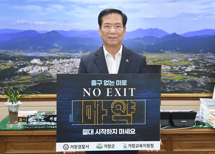 ‘NO EXIT’ 캠페인은 정부가 마약 범죄 단속과 더불어 마약에 대한 경각심을 높여 투약과 중독을 사전에 방지하기 위해 시작한 캠페인으로 거창군은 마약으로부터 군민을 보호하고 안전한 환경을 조성하기 위해 참가했다.
