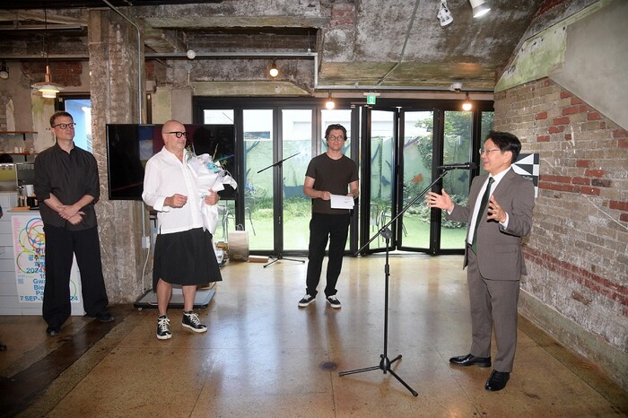 | ▲ 강기정 광주광역시장이 5일 동구 ‘김냇과’에서 열린 제15회 광주비엔날레 페루 파빌리온 개관식에 참석해 축사를 하고 있다. /광주광역시 제공 |