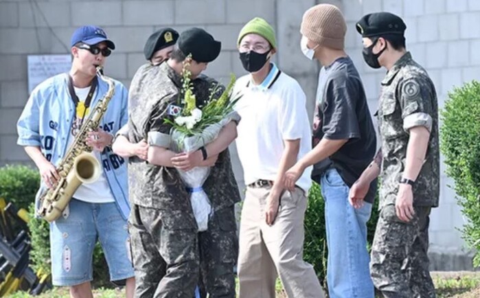 더욱이 이날 방탄소년단 맏형인 진의 전역을 축하하기 위해 슈가를 제외한 방탄소년단 멤버들이 함께 참석해 이목을 집중시켰다. 군악대에서 복무 중인 RM은 색소폰을 직접 연주하며 진의 전역에 대한 기쁨을 표했다.