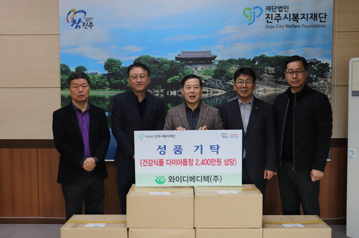 [진주=엄기동 기자] 진주시복지재단은 13일, 와이디메디텍㈜로부터 건강기능식품 800개(환가액 2400만원 상당)를 기탁받았다.