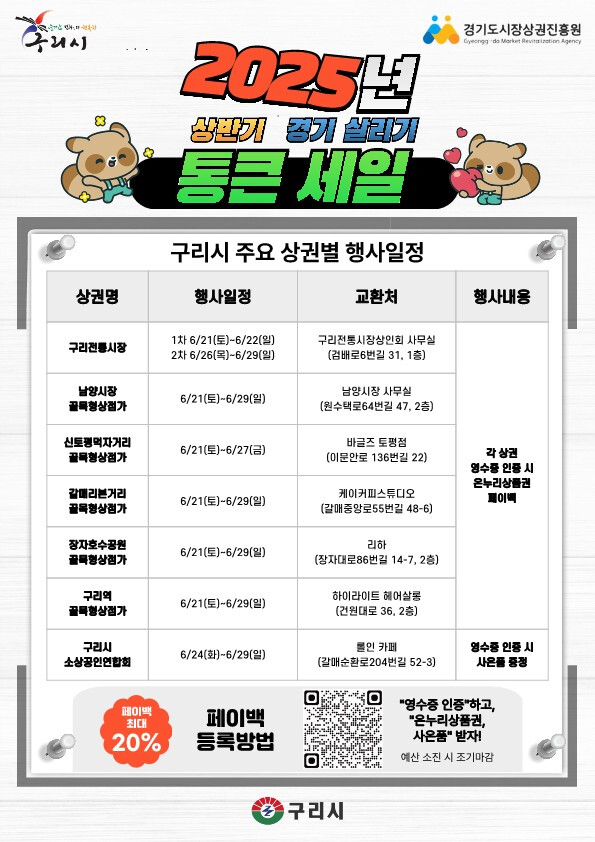 ▲구리전통시장 ▲남양시장 골목형상점가 ▲신토평먹자거리 골목형상점가 ▲갈매리본거리 골목형상점가 ▲장자호수공원 골목형상점가 ▲구리역 골목형상점가 ▲구리시 소상공인연합회 등 총 7개 상권에서 동시에 진행되며, 참여 상권에서 구매한 영수증을 인증하면 소상공인연합회를 제외한 상권에서는 최대 20% 상당의 온누리상품권을, 소상공인연합회에서는 사은품을 제공한다.