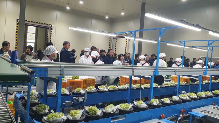 이번 행사는 구인모 군수를 비롯해 농협중앙회 거창군지부, 거창농협, 수승대농협, 북부농협, 거창사과원예농협 조합장과 거창한거창조합공동사업법인 관계자, 포도생산농가 등 80여 명이 참석한 가운데 사업추진 경과보고, 포도 선별라인 시연, 선별 과정 설명 순으로 진행됐다.